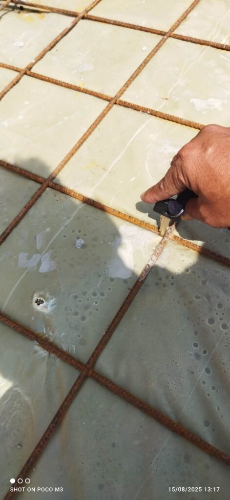 Namun setelah di amati secara kasat mata , bahwa di temukan kondisi Pemasangan Slof Beton tidak ada bantalan dan Wermes tidak berada di tangan pasangan beton , karena bantalan justru tenggelam ke pasir , dan tinggi Bagesting Coran juga diduga tidak mencapai 20 Cm , dapat di prediksi bahwa Ketebalan Bersih pasangan tersebut di mungkinkan tidak tercapai 8 Cm dan posisi Wermes dimungkinkan tidak berada di tengah-tengah pasangan dan Slof Beton sebagian tidak diganjal atau langsung ke tanah. Selain itu , terlihat di lapangan posisi Bantalan Wermes juga tenggelam ke lantai Pasir dan sebagian Posisi Tulangan Slof Beton ke Bagesting disinyalir tidak mencapai Tebal 8 Cm atau 4 cm diatas Wermes ditambah 4 cm di bawah Wermes .